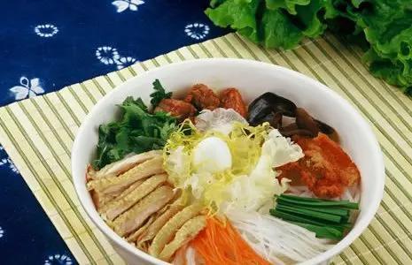 涼雞米線涼雞米線主要是由雞絲和米線制成,雞絲需要煮熟,以核桃醬和小粉做成鹵汁,搭配著辣椒汁和蒜末,為了美觀通常還會(huì)撒些蔥花和芝麻,吃起來(lái)微辣,恰好的酸味,雞肉的嫩和米線的香混為一體,極為爽口,很快就能將一碗滑下肚。